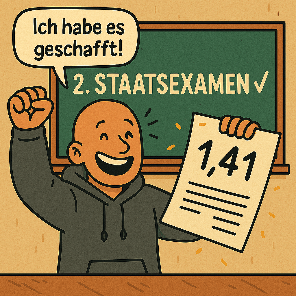 Am Ende stand mein zweites Staatsexamen: 1,41. Ein hervorragendes Ergebnis, das für mich bedeutete: Ich habe es geschafft – und zwar mit Bravour.