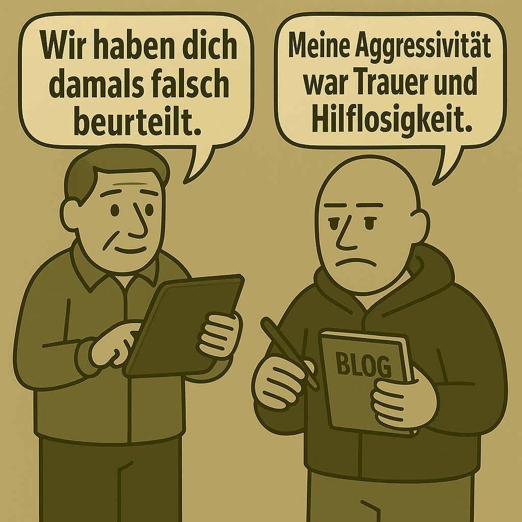 Solche Rückmeldungen bedeuten mir viel. Denn auch ich weiß heute: Meine Aggressivität war nie eine Gefährdung für andere, sondern Ausdruck von tiefer Trauer und Hilflosigkeit. Ich habe mich lange selbst nicht verstanden und musste erst durch Therapien lernen, warum ich so reagiert habe. Auch von meiner Seite möchte ich mich dafür entschuldigen – bei allen Kolleginnen und Kollegen meiner damaligen Realschule.