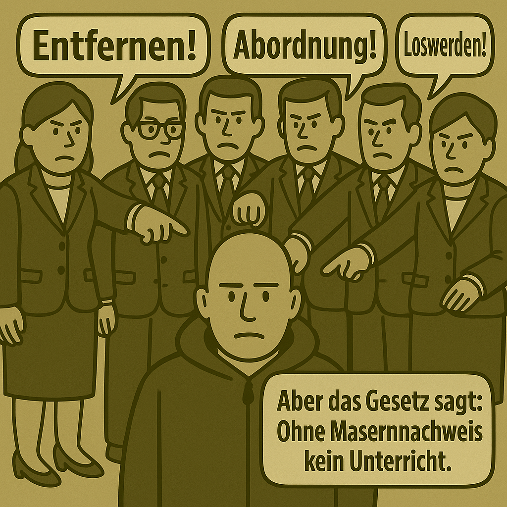 Denn das Gesetz ist eindeutig: Ohne Masernnachweis ist eine Beschäftigung im Schuldienst schlicht unzulässig. Natürlich auch eine Abordnung. Punkt.